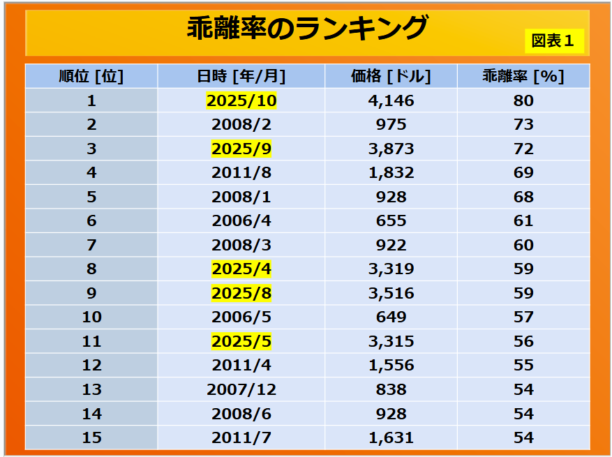 これを見ると、乖離率が一番高いのは今月(2025年10月10日時点)で、その乖離度は80%となっています。