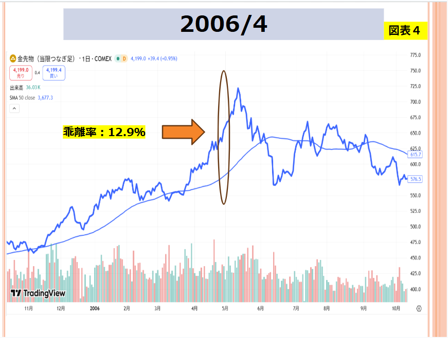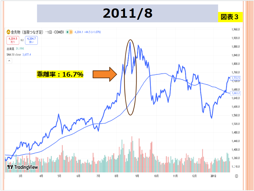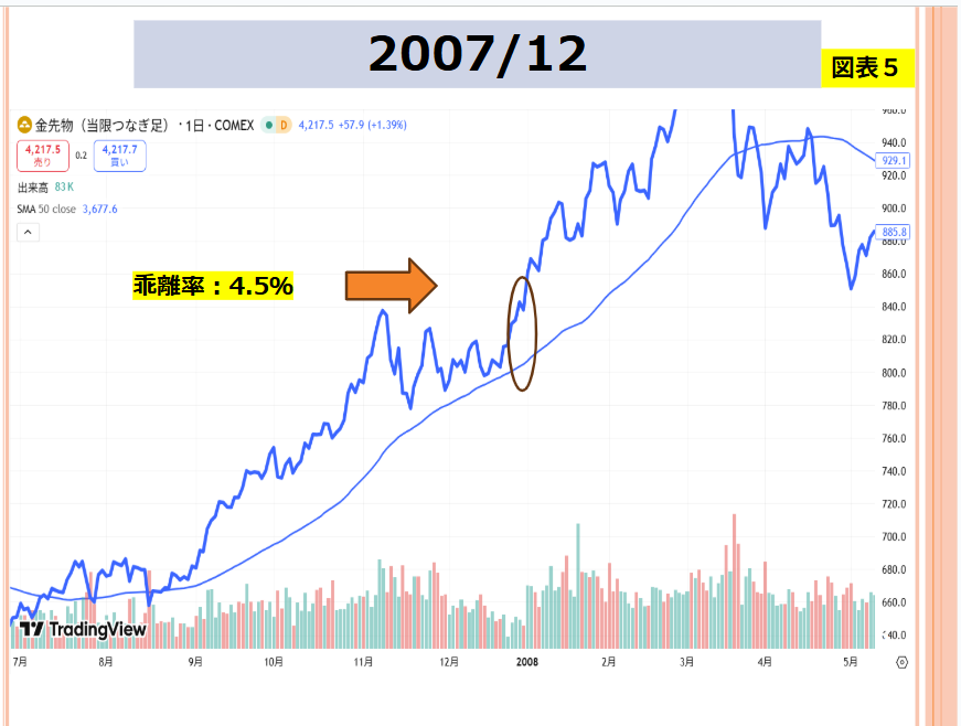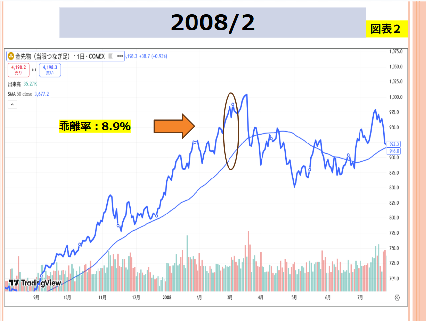 なお、図表中にある移動平均線は50日ものです。例えば、図表2は2008年2月を含んでいます。2月末時点での乖離率(50日移動平均との)は8.9%といった具合です。