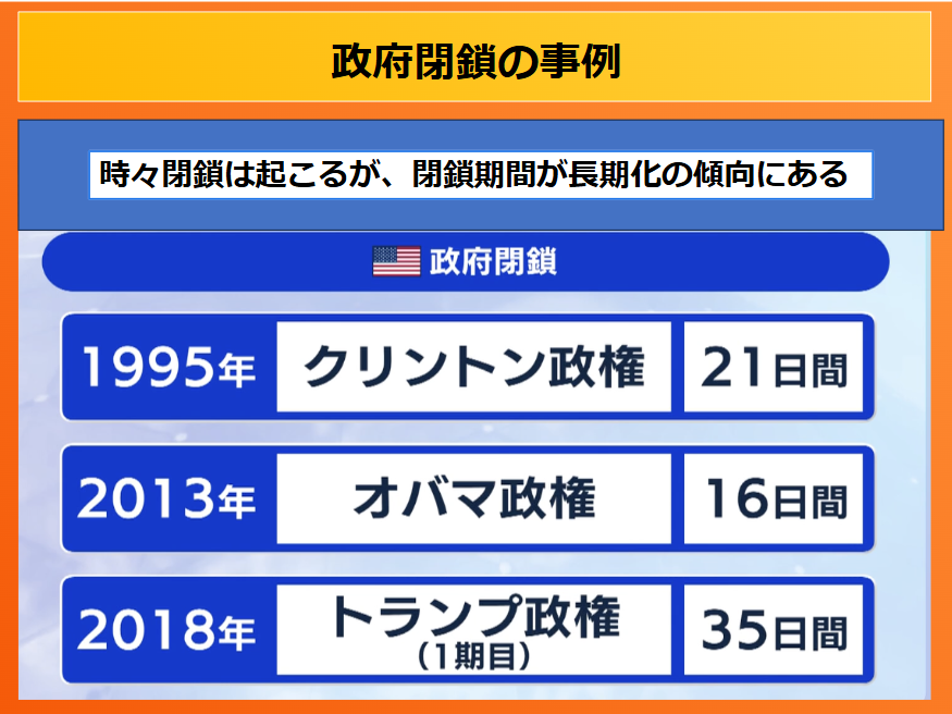 米国は予算不足から時々政府機関の閉鎖を行います。直近の3例を図表に示しました。