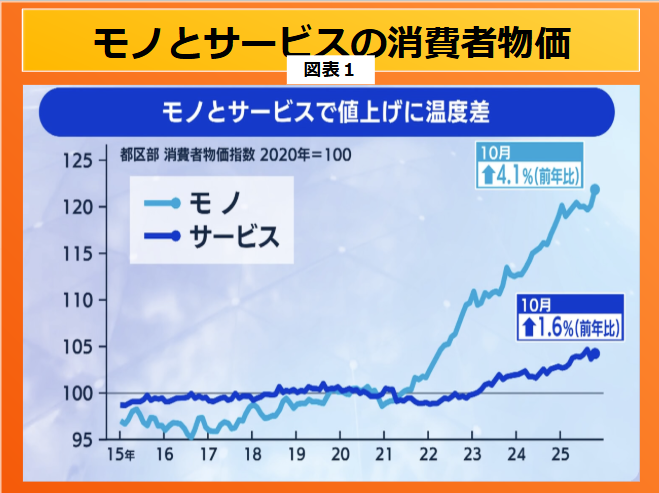 ➊2025年10月現在、モノの価格は前年同月比4.1%と大きく上昇しています。モノの価格とは、文字通り、食品を中心に目に見える形をしているものです。