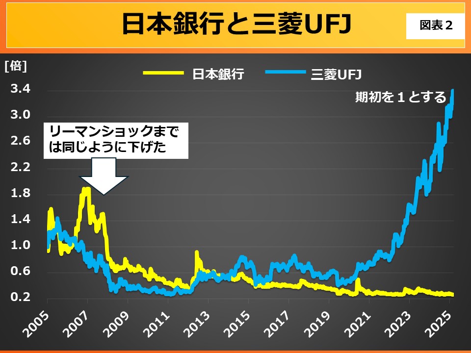 図表2に民間金融機関の代表、三菱UFJフィナンシャル(8306)と比較します。日銀の凋落がさらに明確になります。