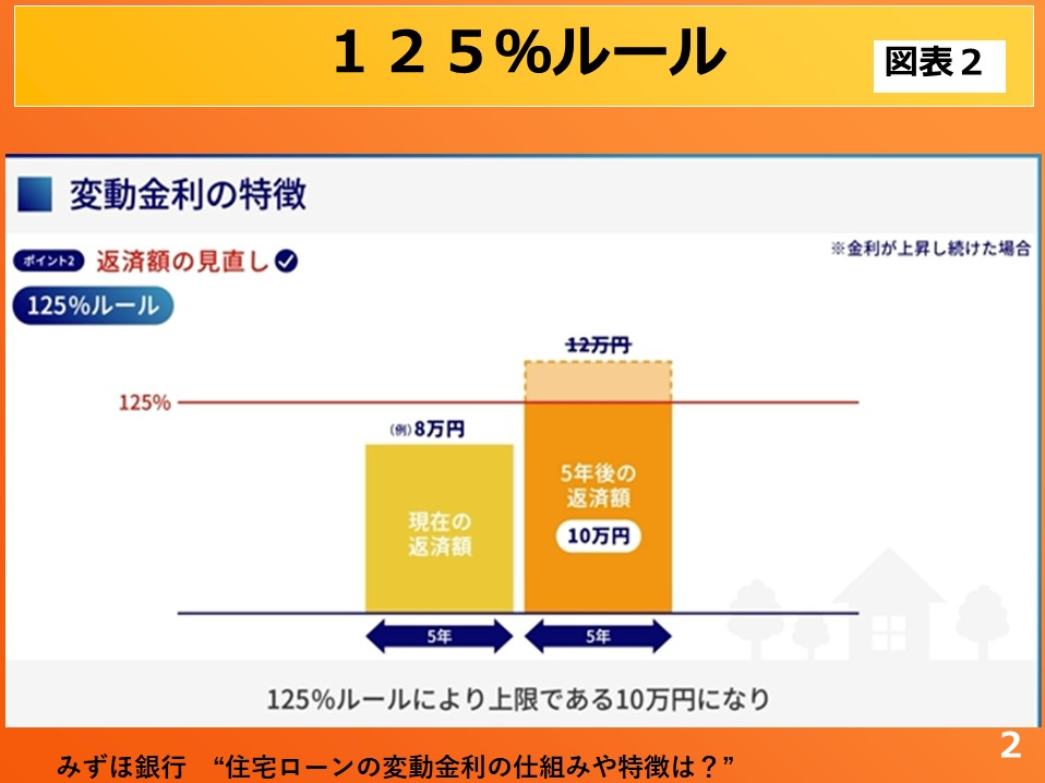 支払い上昇限度額を125%までとするルールです。8万円を払っていた人は最大で125%ルールの増加となります。つまり、毎月の返済額は10万円が限度となるわけです(図表2)。