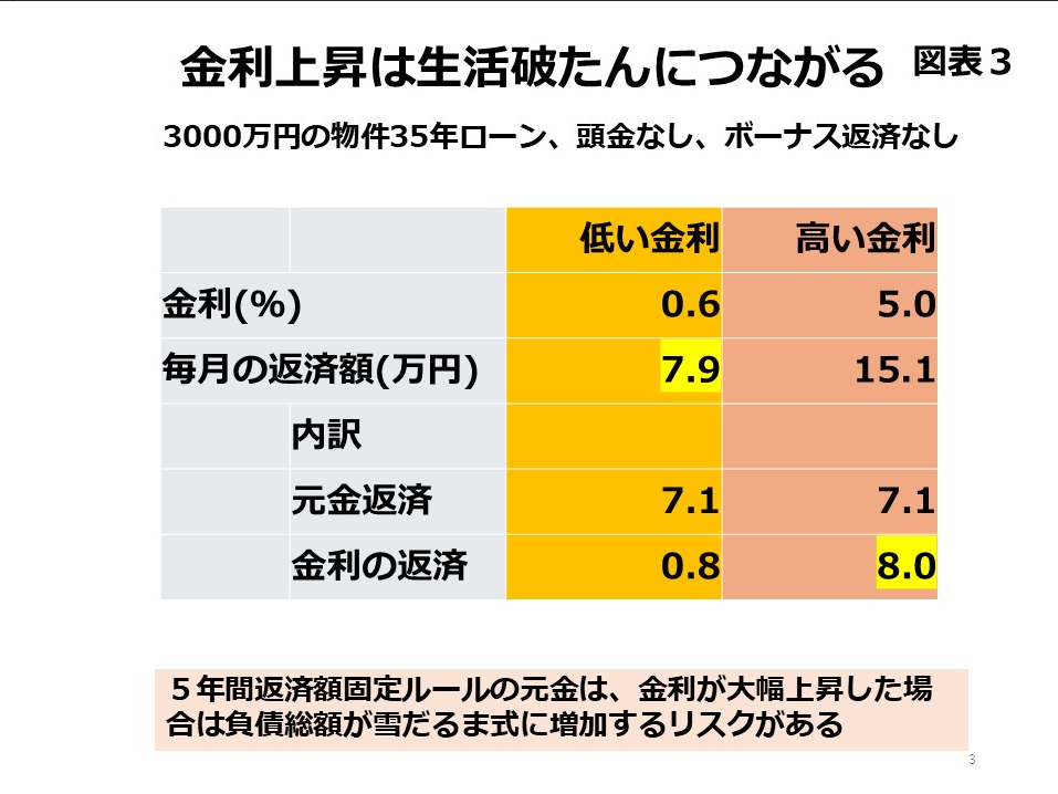 毎月の返済額は守られても、利息は後ろへ回り、総返済額は増えています。返済額を後ろにずらしているだけです。利上げが続けば、借り手の総負担は確実に増えていきます。