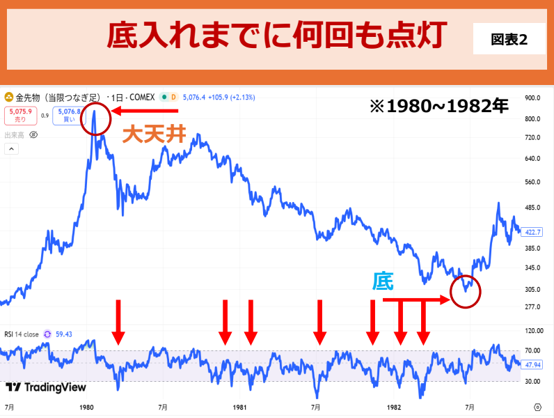 図表2にはその様子が描かれています。1980年1月、ゴールドは歴史的な高値をつけ、その後下落相場が始まりました。高値から底値に至るまで2年以上の月日が必要でした。この間のRSIを図表の下部につけました。