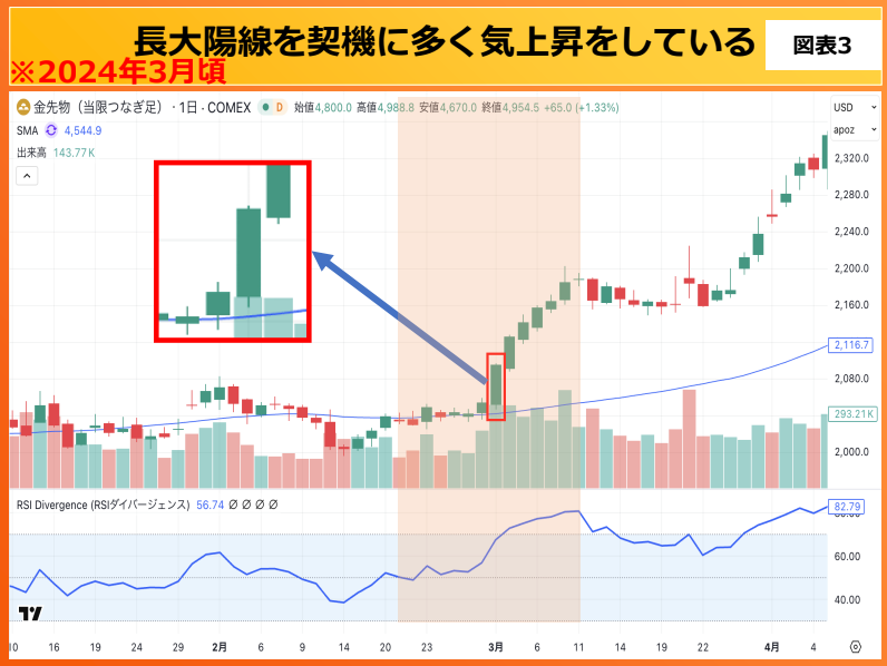 図表3の赤枠の中を見てください。大きな陽線がドンと出ています。これは市場に「強い買いの意思」が入った証拠であり、ここから本格的な上昇トレンドが発生する強力なシグナルとなります。
