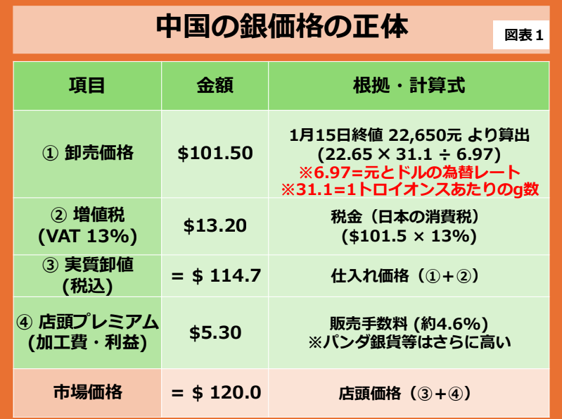 中国では、銀の地金を購入する際に13%の増値税(VAT)が課せられます。日本で言う消費税です。先物価格が101.5ドルだとしても、そこに13%の税金が乗るだけで自動的に114.7ドルになります。さらに販売店の利益(プレミアム)を5ドル程度乗せれば、あっという間に120ドルに達します。
