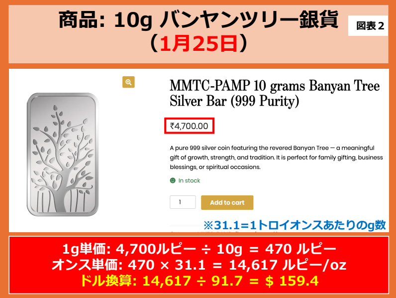 インドの150ドルにも同様に消費税や販売店の利益が含まれています。140〜160ドルといった極端な高値の正体は、図表2のような高級銀貨です。