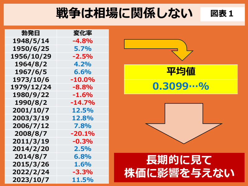 図表1を見てください。第二次大戦後に起きた主な戦争について、開戦日から3か月後の米国株価の変化を調べると、次の結果となっています。