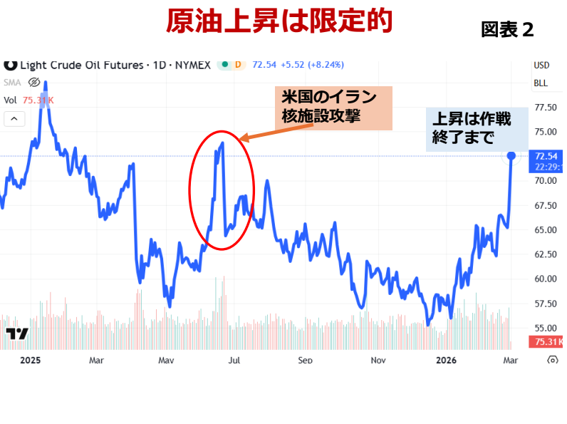 図表2にあるように、原油価格は2025年6月の米国によるイラン核施設攻撃を受けて大きく上昇しました。しかし、それはごく短時間のことでした。その後は攻撃以前の水準に戻ってしまいました。