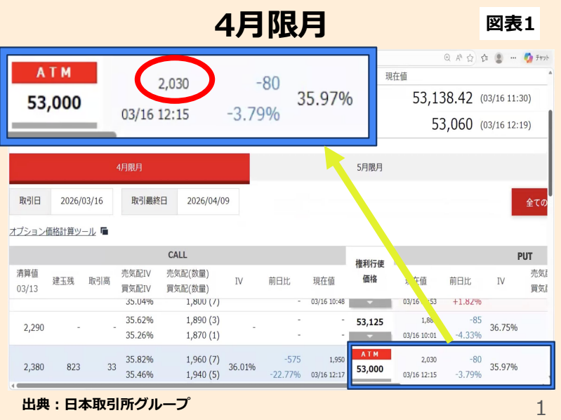 図表1にあるように4月9日が取引最終日となる4月限月のデータを見ると、権利行使価格53000円のプットオプション価格は2030円です。