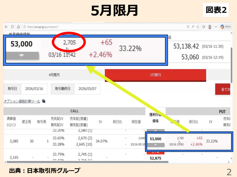 一方で、図表2の5月7日が取引最終日となる5月限月のデータを見ると、同じ権利行使価格53000円のプットオプション価格は2705円となっています。