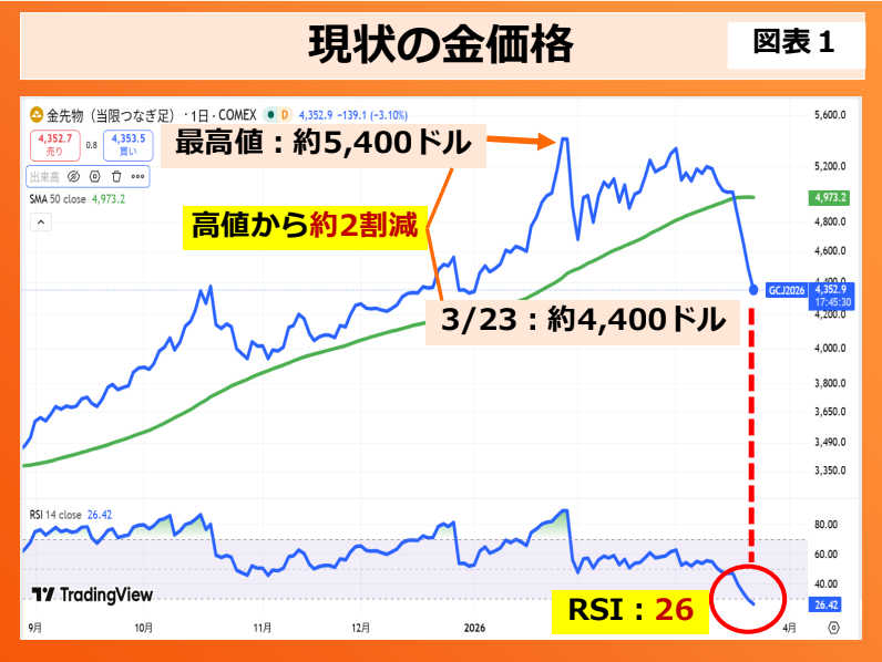 金価格は近いうちに反発に入ると考えています。図表1にあるように、RSIが30を割り込み、売られ過ぎの状態を示しているからです。
