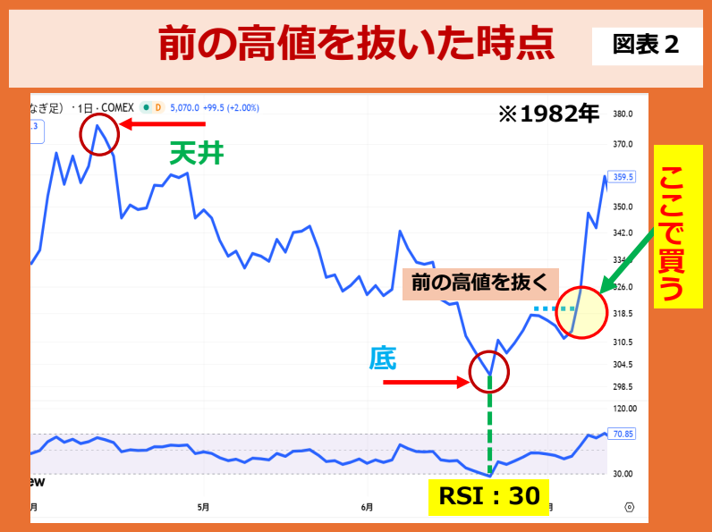❶テクニカル分析を用いる。具体的にはRSI30・50で買う。新高値で買う