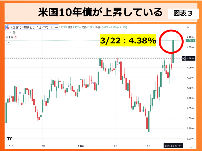 その理由は、図表3にあるように、債券利回りが急上昇したことにあります。(これは、債券価格が急落した、と同じ意味です。)従来は、株式価格が下落した際には、債券利回りは低下してきました。景気の悪化に伴い、資金需要が減るので、金利が低くなるのが常でした。