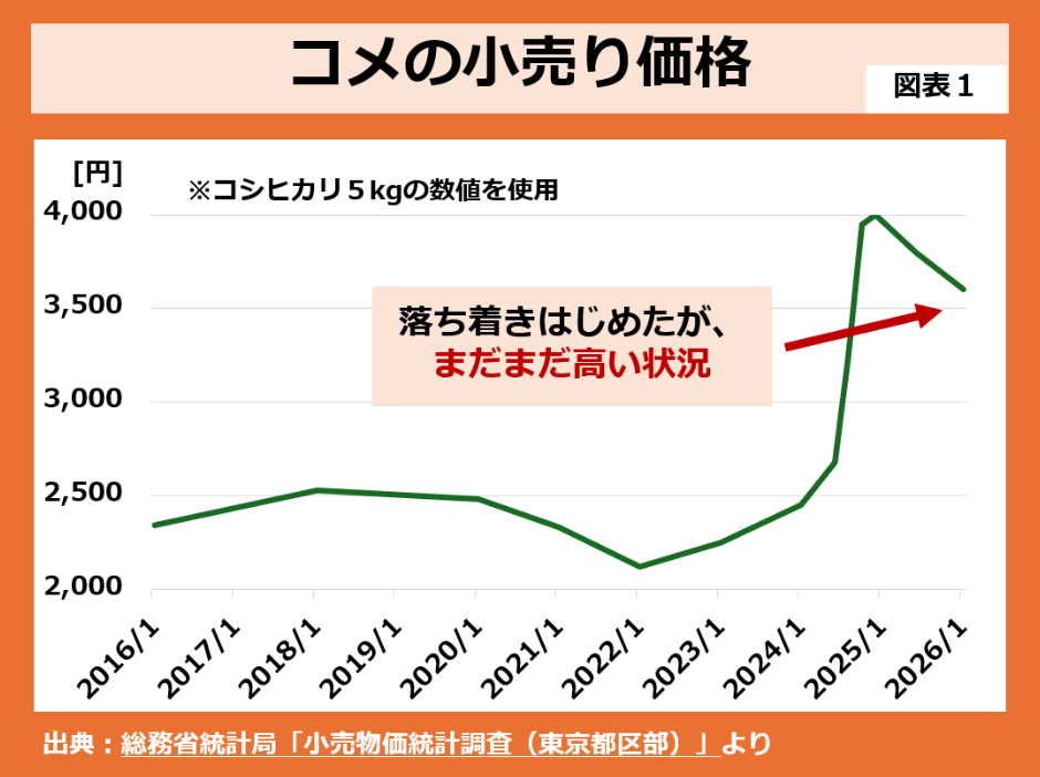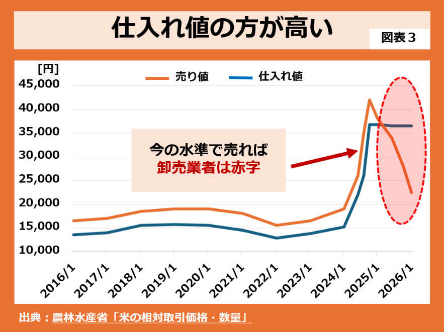 死活問題となっているのは卸売業者です。図表3にあるように、仕入れ価格(青線)が高値でとどまっています。価格高騰が続くとの思惑から、2025年秋の新米を農家やJAから収穫前に予約買いをしていたのでしょう。典型的な高値掴みです。