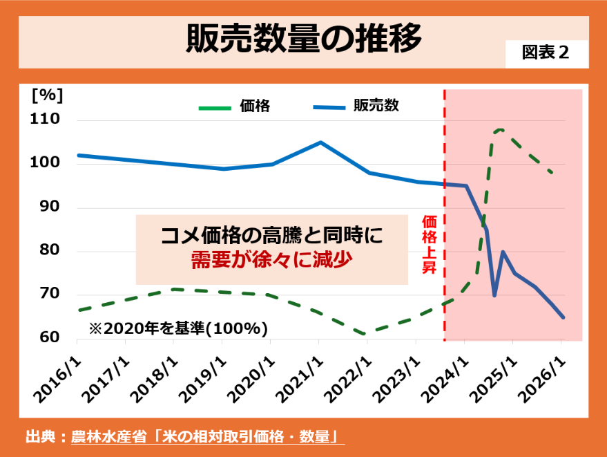 ところが、最近になって価格が下がり始めています。理由は販売量の減少です。一般に値段が上がれば、買いたい人が減ります。図表2にあるように、コメ価格の上昇と反比例するように、青い線の「販売数量」が急落していることが分かります。2020年を100とした場合、現在は60〜70近くまで落ち込んでいます。