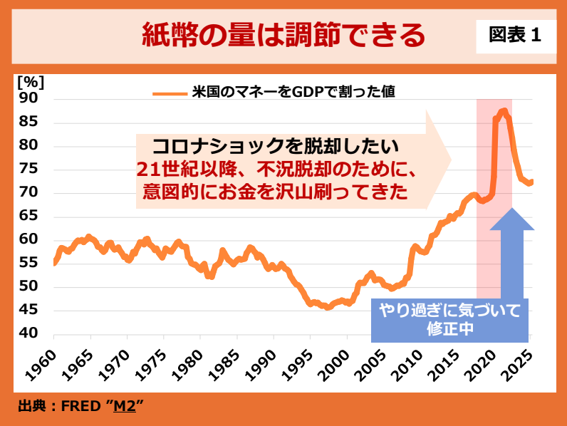 各国の政府は紙幣を刷り続けています。図表1にあるように米国のマネー(対GDP比)はITバブル崩壊時には45%程度でした。ITバブルやリーマンショック、コロナからの脱却を目指して、米国政府は通貨の発行を加速し、最大で90%弱にまで増加しました。簡単に言えば、マネーが倍増してしまったのです。(その後、あまりにやり過ぎたので、修正を図っています。)