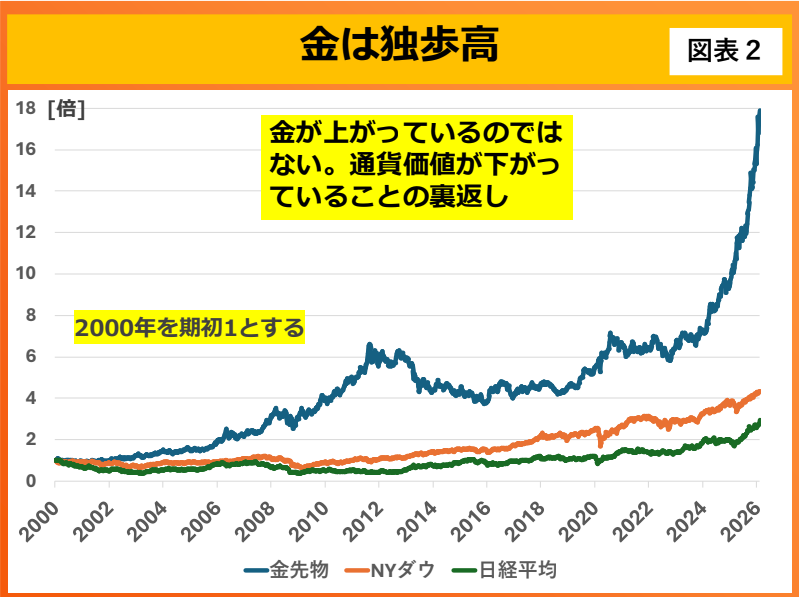 このことは図表2に示されています。金価格の上昇はNYダウや日経平均に比べて大幅高になっています。見方を変えれば、金が上がっているのではなく、偽物の通貨で表示されている投資物件(この場合は株式)の価値があまり上がっていないということがわかります。