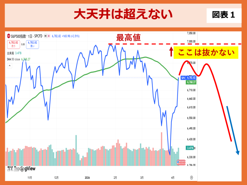 図表1を見てください。今後の株価予想を赤いラインで示しました。これまでの大天井を抜かず、下落に転じる。これがぼくの予想です。この話は既に3月28日のセミナーにてお話ししました。