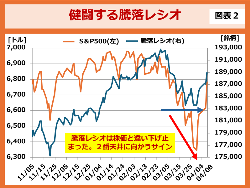 その理由を騰落レシオで説明します。騰落レシオとは日々の上昇銘柄数に下落銘柄数を引いた指標です。図表2を見て下さい。「直近の下落でも株価に比べて強気のサインを示しているので、2番天井に向かう」というのが経験則です。