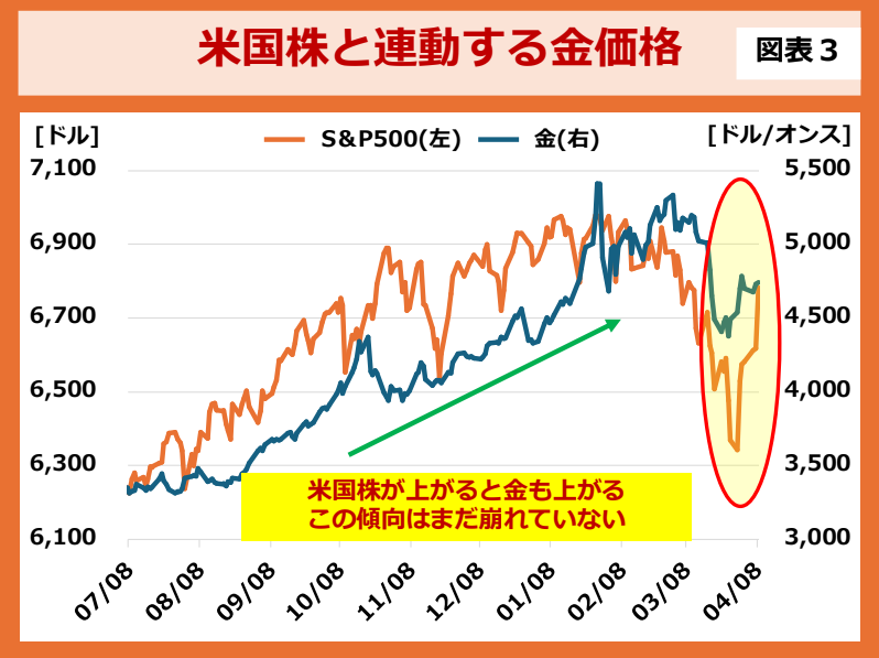 別の言い方をするならば、「将来株価が下落方向に転じれば、一緒に下落に向かう局面が始まるだろう」ということになります。これも横ばい圏の中での下落です。横ばい圏の中でも株価と金価格は連動すると考えます。図表3のように過去から連動が続いてきたからです。