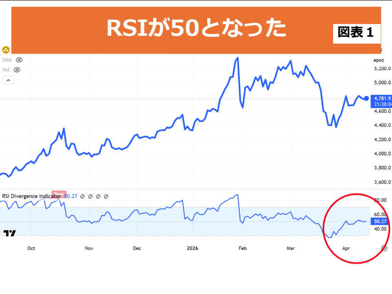 図表1にあるように、RSIが50に達しました。「RSIが50」というのは中立状態です。この指数は0~100の間を行き来するもので、実際は20(売られすぎ)から、80(買われすぎ)の間をうろうろすることが多いです。