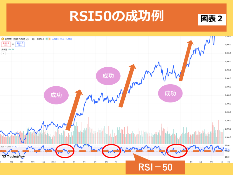 図表2にあるように、RSI=50が出現してその状態が続いた場合、その後、金価格が上がっている例を多数見受けます。