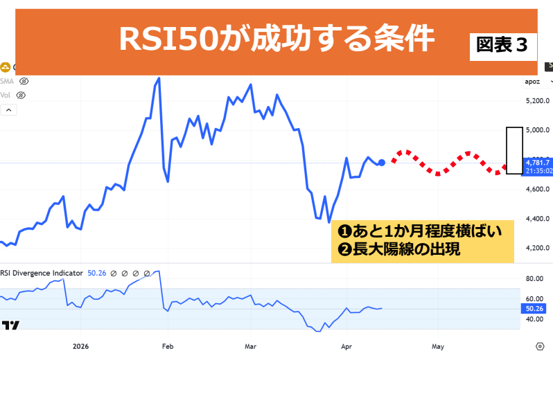 しかし、RSI=50が1か月間続かない場合も想定されます。仮に、価格が下落すれば、RSIはまた30に戻るかもしれません。そこで買いシグナルが出るのを待つことになります。