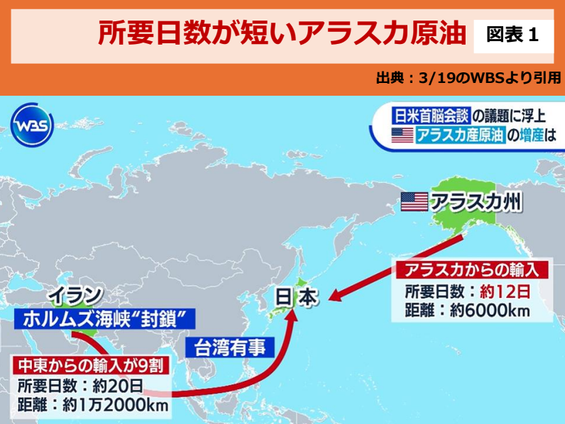 しかも、図表1にあるように、アラスカ原油は中東原油よりも輸入に要する日数が8日ほど短いメリットをもっていることも強調されています。