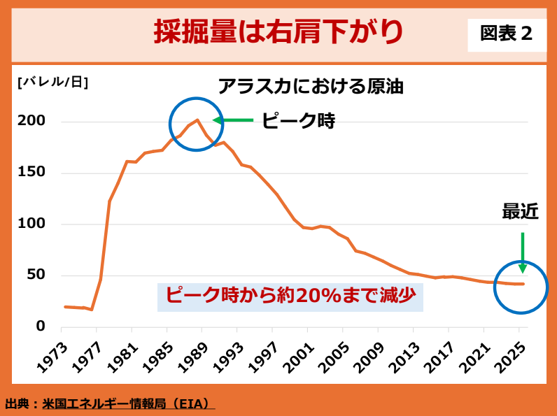 現在アラスカでは、ウィロー・プロジェクトという巨大油田開発事業が進められています。アメリカ西海岸の産業を支えていたプルドーベイ油田が枯れ始めているためです。図表2からも分かるように、アラスカ全体の原油生産量はピーク時の200万バレル(約3.2億リットル)からみれば、現在は約20%です。