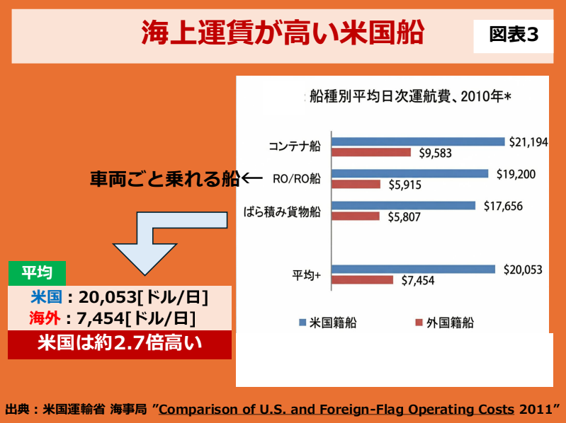輸送費にも問題があります。米国の船・船員を用いなければならないからです。ジョーンズ法が根拠です。この法律は1920年の制定から100年以上も米国湾内の海上輸送を厳しく制限しています。具体的には「米国内の港どうしで輸送を行う場合、米国の旗が立ち、米国船員の乗った船を使うこと」を義務づけた法です。他国と比べてみると、平均して約2.7倍の費用がかかります。図表3に記しました。