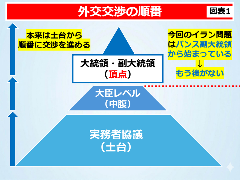 図表1にあるように、外交交渉の定石は、土台である実務者協議から始め、中腹の大臣レベル、そして頂点の大統領や副大統領へと順番に進めるものです。今回の協議は、大相撲で言えば、初めから横綱同士を戦わせるようなものでした。権限のある人間が最大限譲歩し合ったはずですから、物別れとなれば、もう後がありません