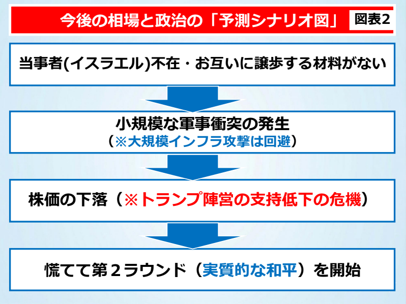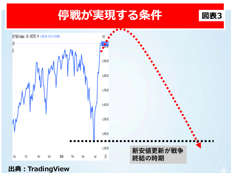 では、米国はいつ実質的な和平へ動くのでしょうか。図表3のチャートをご覧ください。現在、米国株価は和平協議の開始を好感して上昇局面を迎えています。しかし、和平協議決裂が明確になると、株価は再び下げるようになるでしょう。