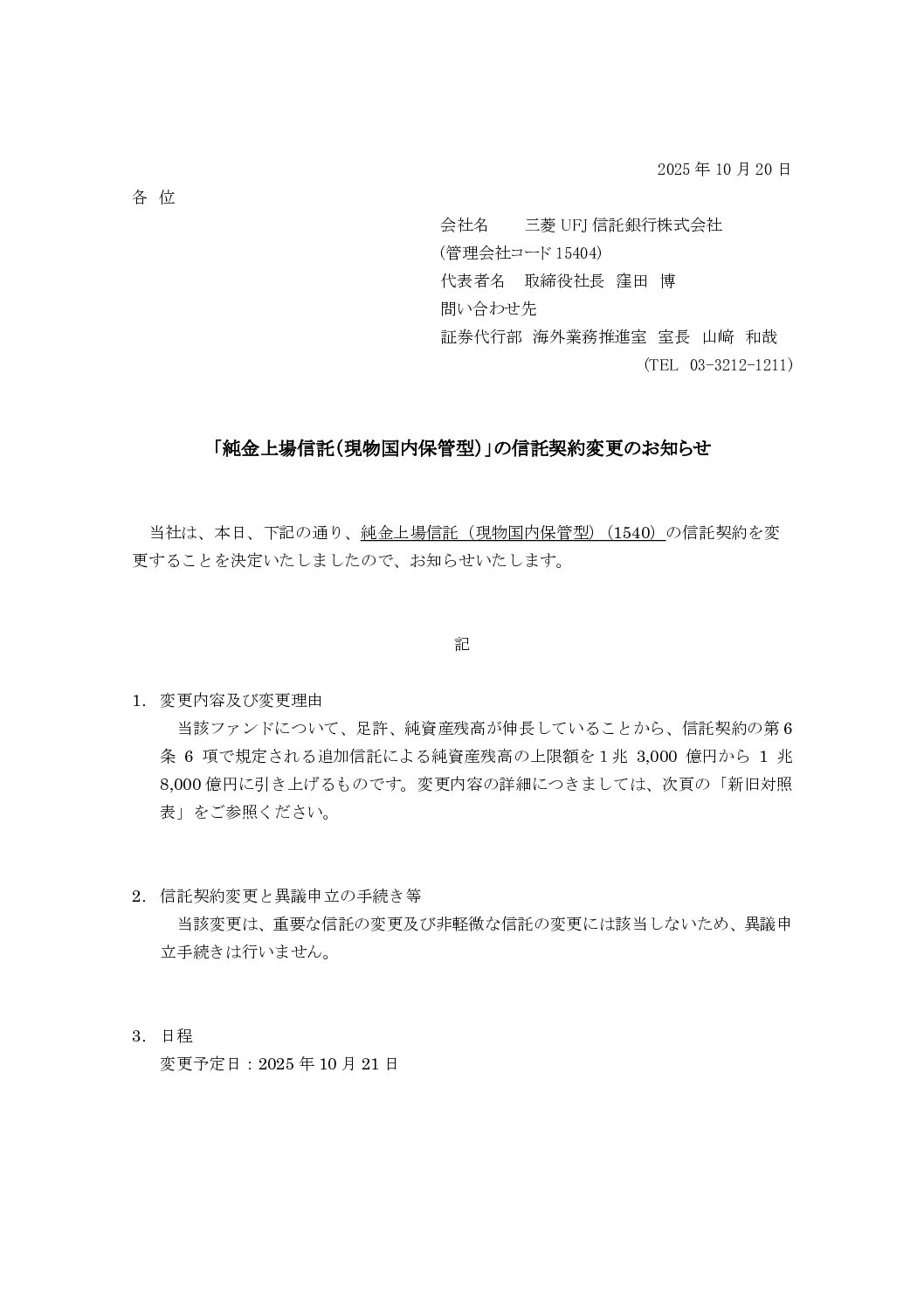 一方、20日の取引終了後に、1540の信託上限引き上げのリリースがあった(添付)。これは注目。これまでは純資産残高が上限の1.3兆円に迫っていたが、この上限が1.8兆円に引き上げられたことで、ETFの供給が加速する。つまり、需給のバランスが整い、乖離が小さくなる方向に向かう圧力となる。ただし、Bruce Ikemizu氏がXで指摘するように、1540の裏付けとなっている金地金を保管する倉庫の上限額やその保険等の問題で、証券化が滞っているという1540特有の事情があるらしく、乖離がどれくらいのスピードで小さくなるかは不明。一番手っ取り早いのは売り禁を解除することだが、これは運用会社としては最終手段だろう。引き続き注視が必要。