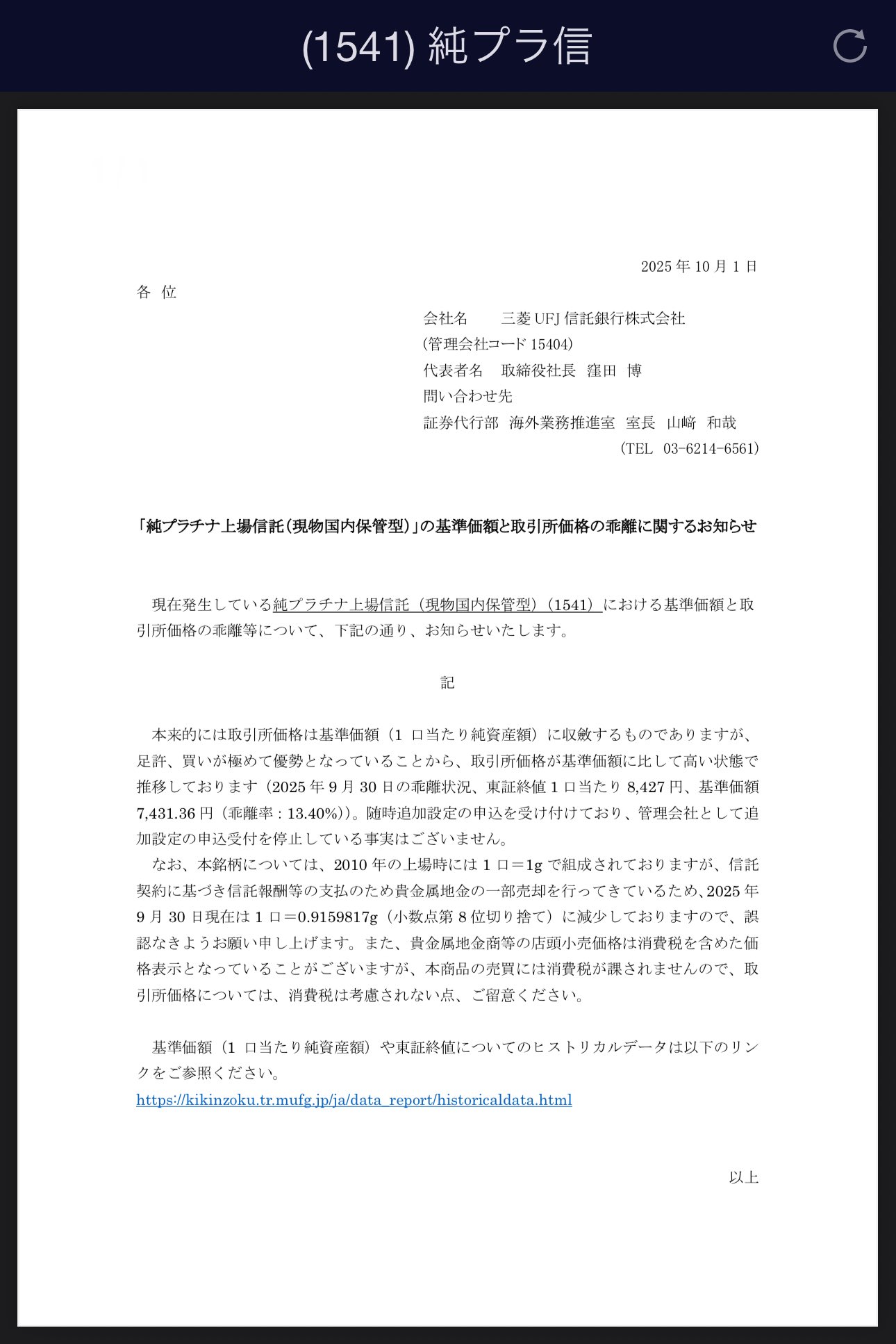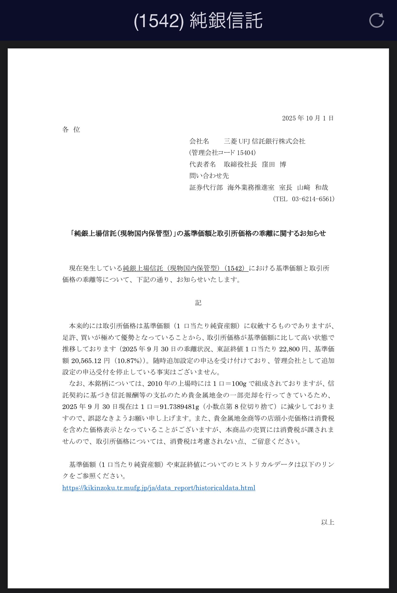 ここ数日、金(1540)、プラチナ(1541)、銀(1542)ETFの取引価格が基準価額に比べて10%程度高くなる現象が続いていましたが、ついに昨日17時に、三菱UFJ信託銀行から添付の注意喚起が出ました。本日以降に大幅な下落が起こる可能性が高いため、保有している皆様はどうぞお気をつけて。