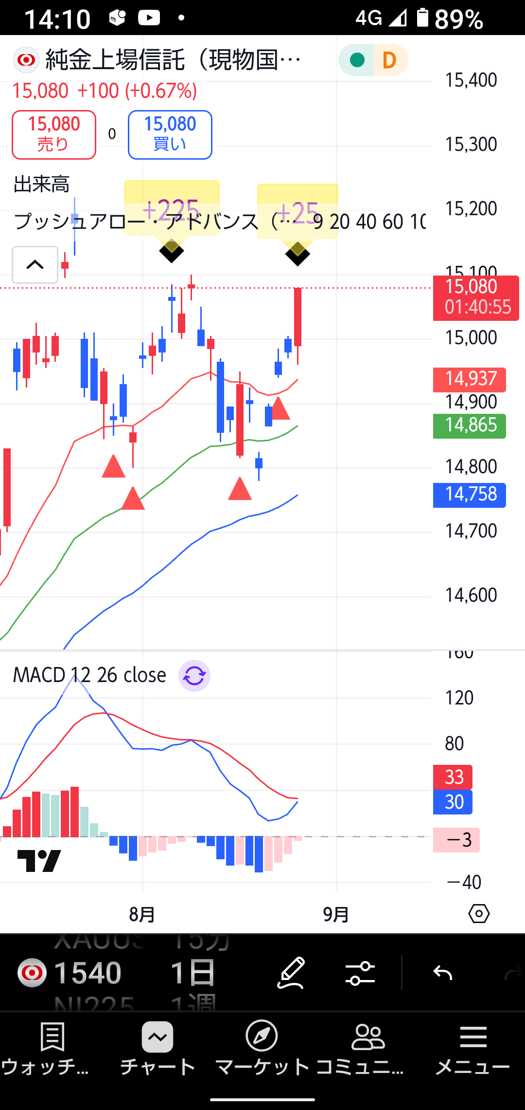 金(現物)は4万円位まで上昇見込みが先生の仮説です。売るなんてトンデモナイ!1540も少なくとも倍以上になる見込みです。6か月のチャートを見てください。ずっと上昇しながら月1回位10%程度の下落があり丁度その時期と思われ追加購入のチャンスです!どーんとまとめて買いたいのを我慢してちびちび分散かつ安く追加購入したいのでもう少し下がって欲しいと期待しています。