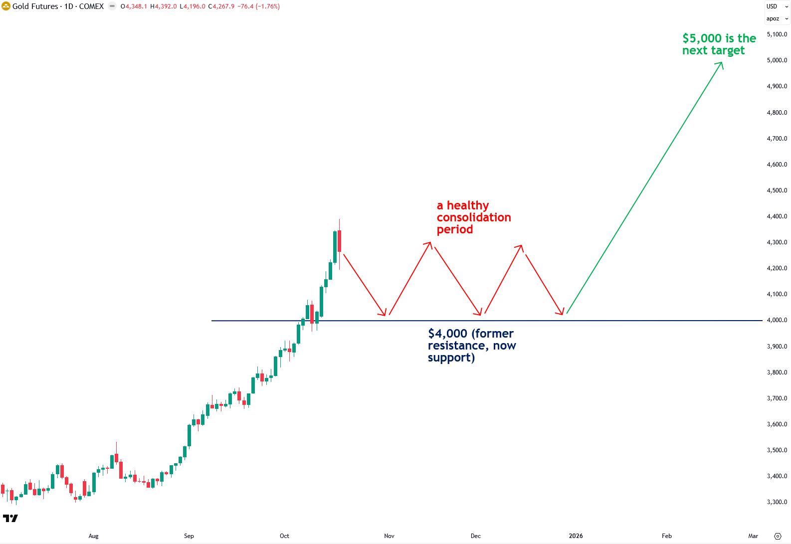 10月21日、金スポット価格は4380ドルをつけた後、9%程の下落を起こしました。この4400ドル付近での調整を8月5日時点(直近の金価格高騰前)で予測していたのが、貴金属投資家のJesse Colombo氏です(添付図)。
